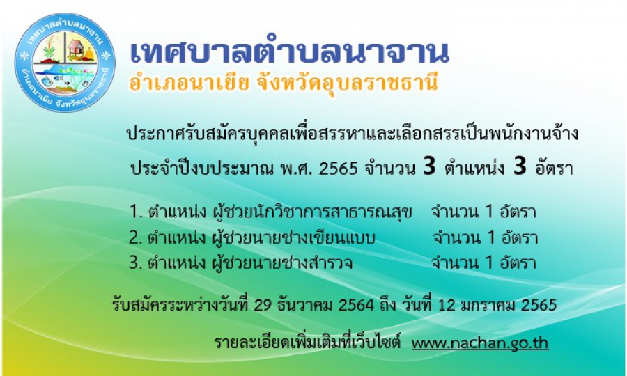 ชื่อเรื่อง : ประกาศเทศบาลตำบลนาจาน เรื่อง รับสมัครบุคคลเพื่อสรรหาและเลือกสรรเป็นพนักงานจ้าง ประจำปีงบประมาณ พ.ศ.2565